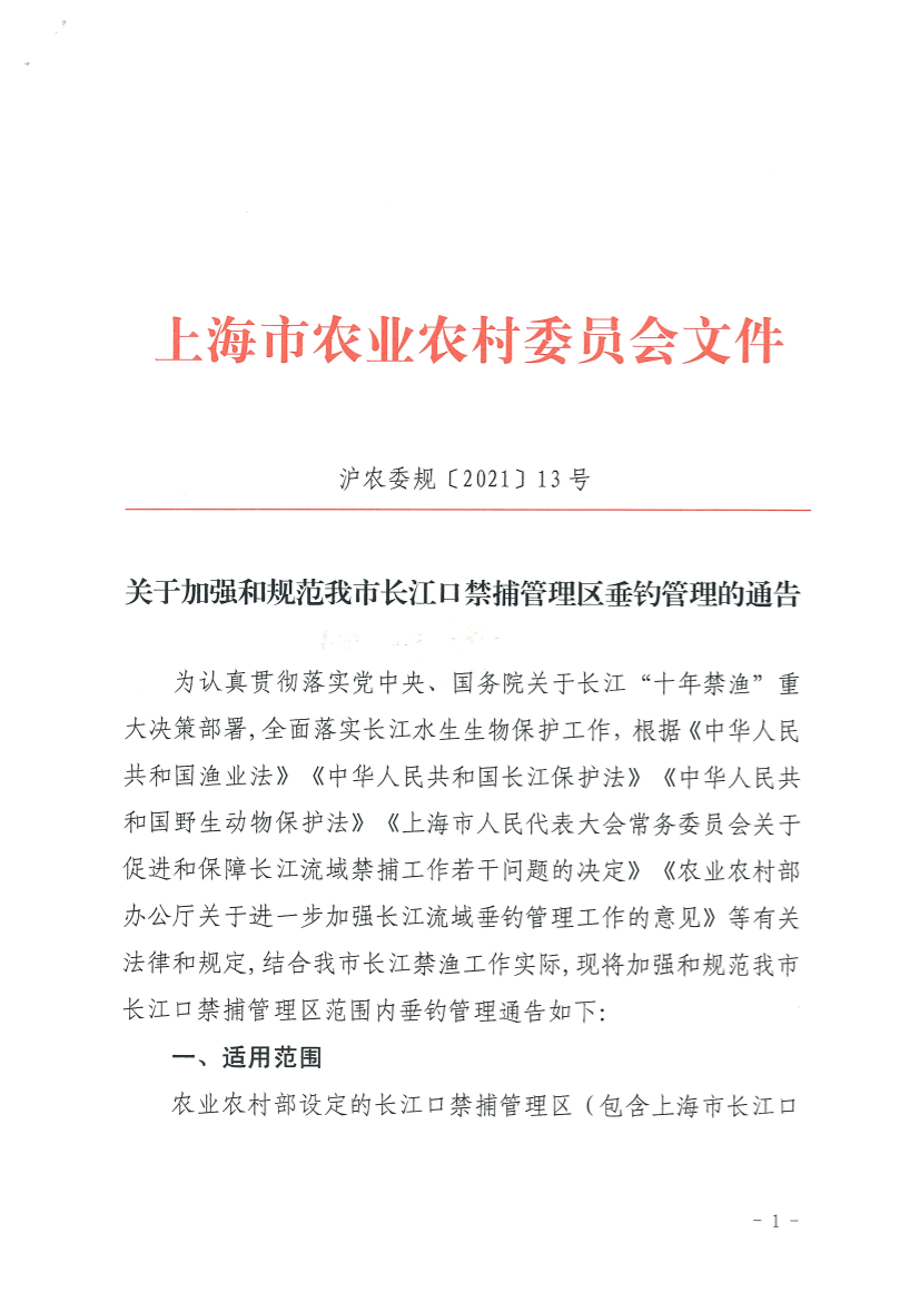 为认真贯彻落实党中央、国务院关于长江“十年禁渔”重大决策部署,全面落实长江水生生物保护工作,根据《中华人民共和国渔业法》《中华人民共和国长江保护法》《中华人民共和国野生动物保护法》《上海市人民代表大会常务委员会关于促进和保障长江流域禁捕工作若干问题的决定》《农业农村部办公厅关于进一步加强长江流域垂钓管理工作的意见》等有关法律和规定,结合我市长江禁渔工作实际,现将加强和规范我市长江口禁捕管理区范围内垂钓管理通告如下: