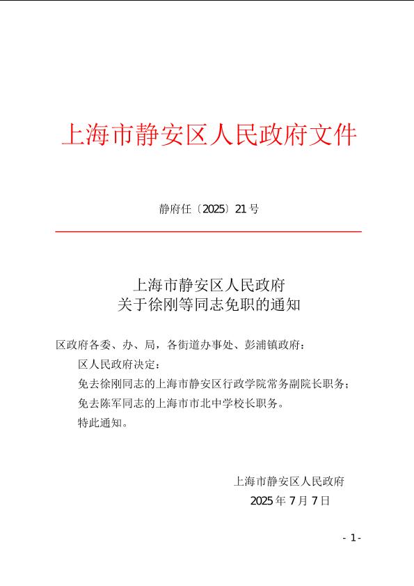 免去徐刚同志的上海市静安区行政学院常务副院长职务;