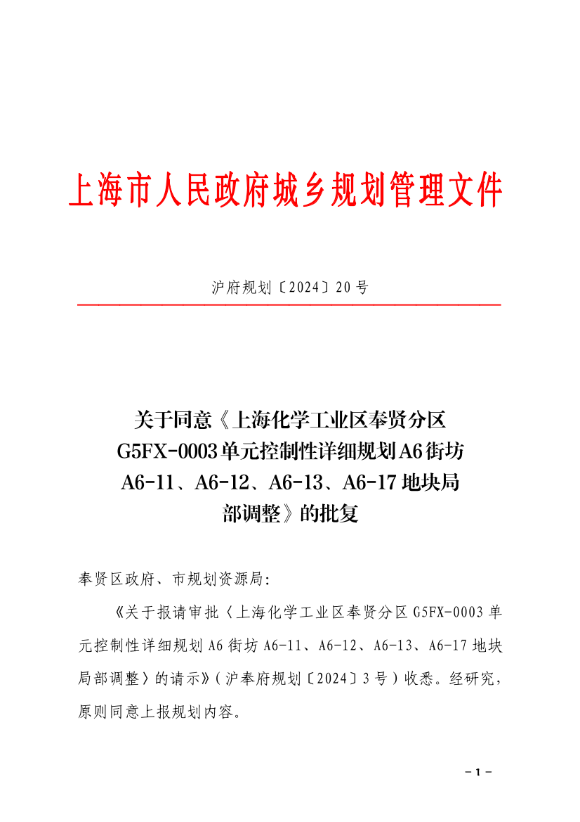 《关于报请审批〈上海化学工业区奉贤分区G5FX-0003单元控制性详细规划A6街坊A6-11、A6-12、A6-13、A6-17地块局部调整〉的请示》(沪奉府规划〔2024〕3号)收悉。经研究,原则同意上报规划内容。