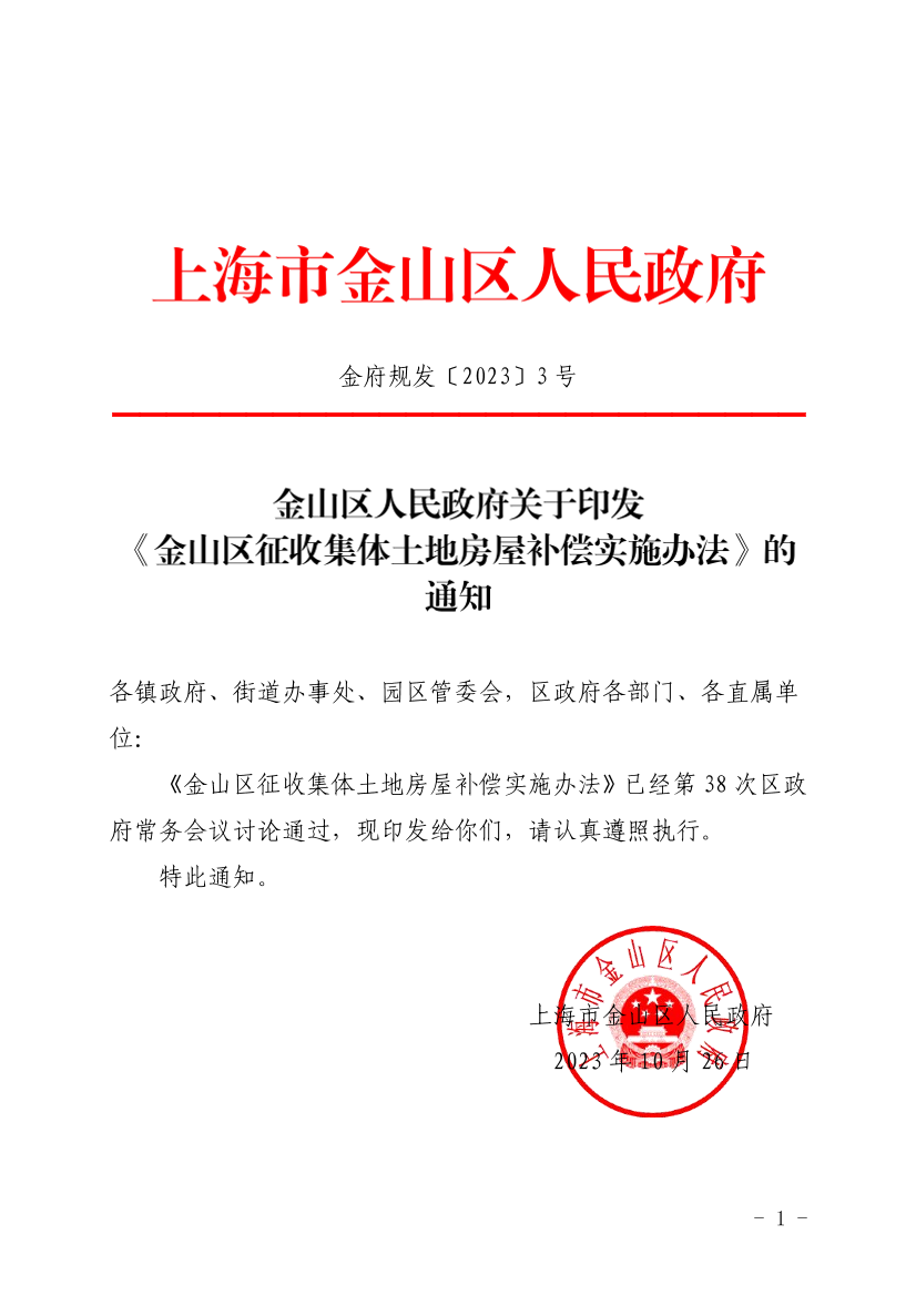 《金山区征收集体土地房屋补偿实施办法》已经第38次区政府常务会议讨论通过,现印发给你们,请认真遵照执行。