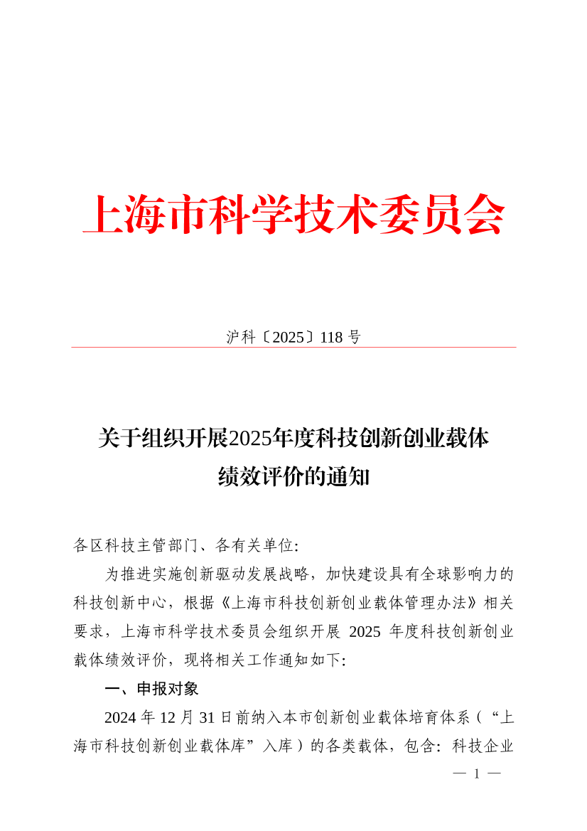 为推进实施创新驱动发展战略,加快建设具有全球影响力的科技创新中心,根据《上海市科技创新创业载体管理办法》相关要求,上海市科学技术委员会组织开展2025年度科技创新创业载体绩效评价,现将相关工作通知如下: