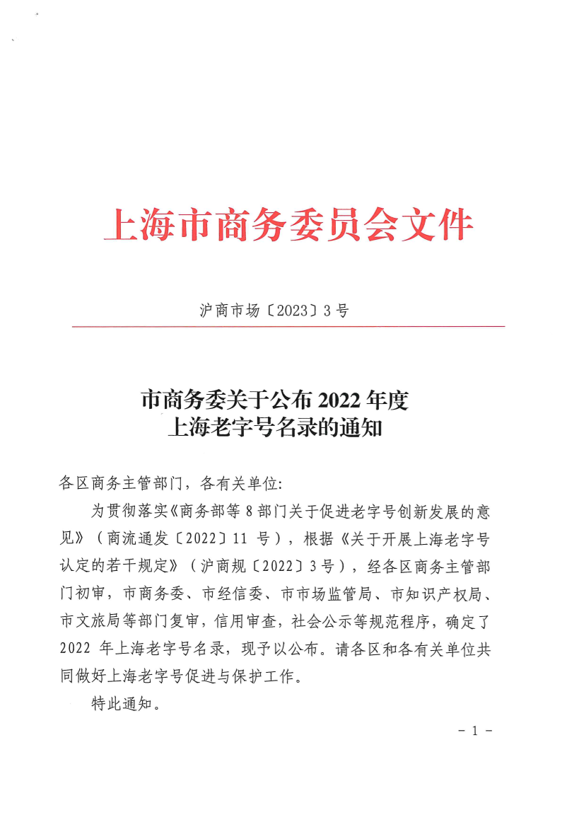 为贯彻落实《商务部等8部门关于促进老字号创新发展的意见》(商流通发〔2022〕11号),根据《关于开展上海老字号认定的若干规定》(沪商规〔2022〕3号),经各区商务主管部门初审,市商务委、市经信委、市市场监管局、市知识产权局、市文旅局等部门复审,信用审查,社会公示等规范程序,确定了2022年上海老字号名录,现予以公布。请各区和各有关单位共同做好上海老字号促进与保护工作。
