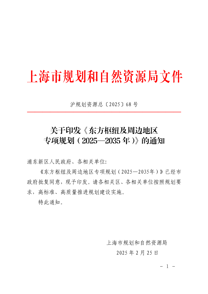 《东方枢纽及周边地区专项规划(2025—2035年)》已经市政府批复同意,现予印发。请各相关区、各相关单位按照规划要求,高标准、高质量推进规划建设实施。