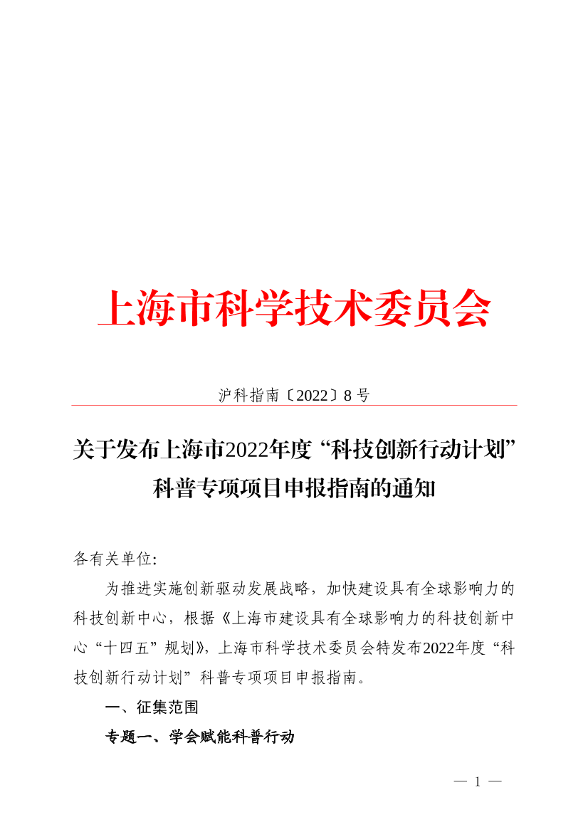 为推进实施创新驱动发展战略,加快建设具有全球影响力的科技创新中心,根据《上海市建设具有全球影响力的科技创新中心“十四五”规划》,上海市科学技术委员会特发布2022年度“科技创新行动计划”科普专项项目申报指南。