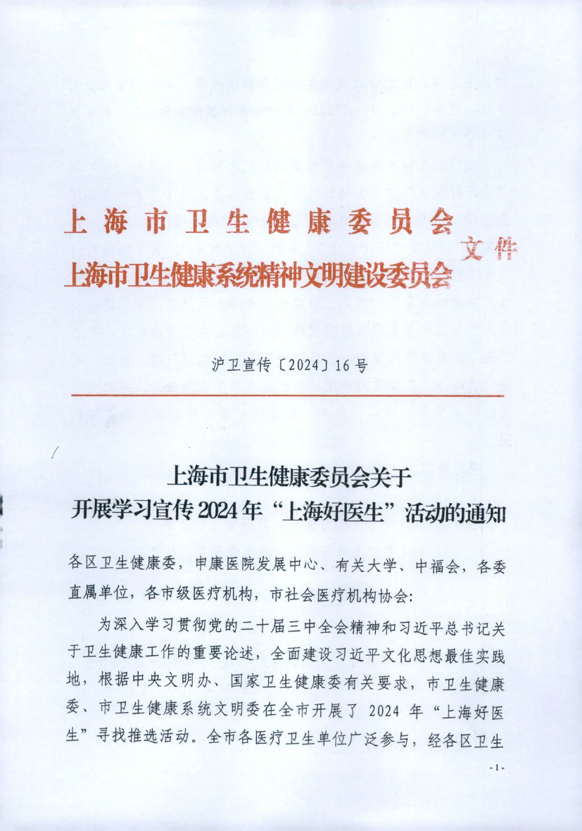 为深入学习贯彻党的二十届三中全会精神和习近平总书记关于卫生健康工作的重要论述,全面建设习近平文化思想最佳实践地,根据中央文明办、国家卫生健康委有关要求,市卫生健康委、市卫生健康系统文明委在全市开展了2024年“上海好医生”寻找推选活动。全市各医疗卫生单位广泛参与,经各区卫生健康委、各办医主体以及相关部门等遴选推荐、专家评审和点赞评议,最终产生了20名2024年“上海好医生”和10名提名奖获得者(名单见附件)。