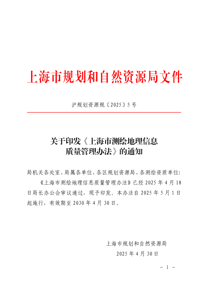 《上海市测绘地理信息质量管理办法》已经2025年4月18日局长办公会审议通过,现予印发。本办法自2025年5月1日起施行,有效期至2030年4月30日。