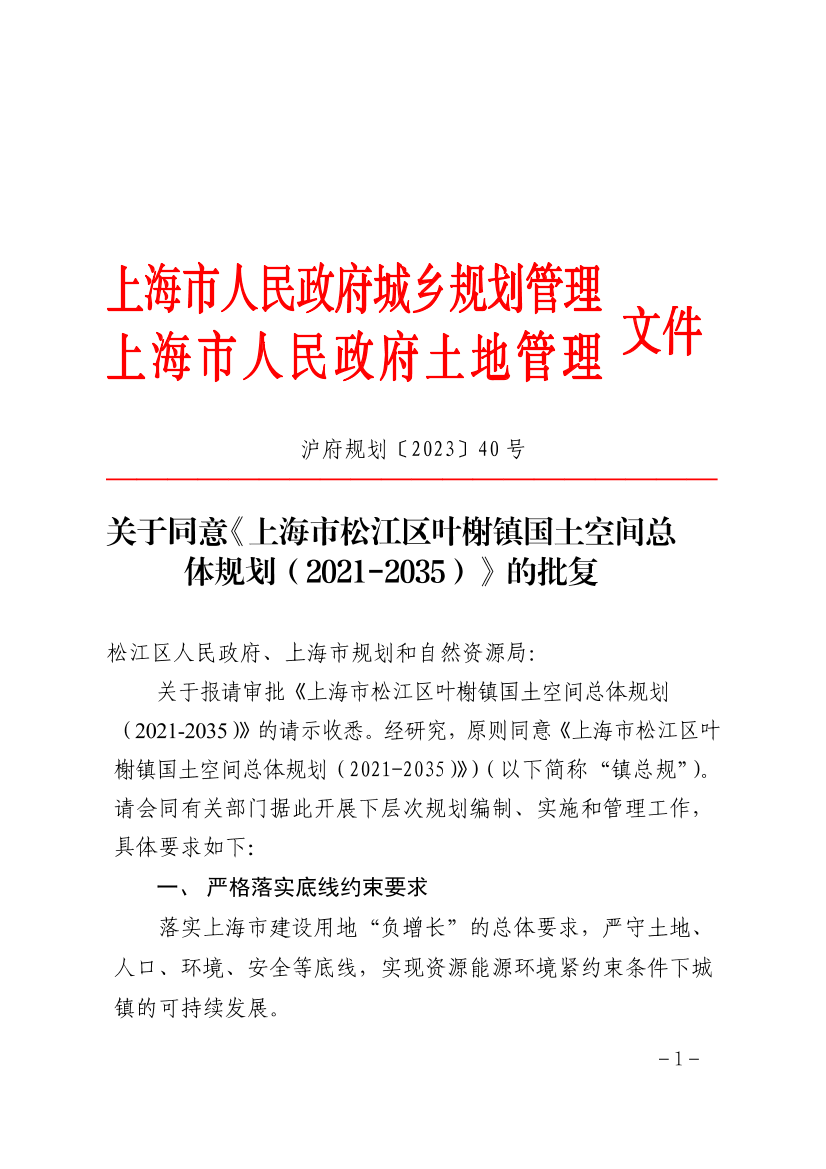 关于报请审批《上海市松江区叶榭镇国土空间总体规划(2021-2035)》的请示收悉。经研究,原则同意《上海市松江区叶榭镇国土空间总体规划(2021-2035)》)(以下简称“镇总规”)。请会同有关部门据此开展下层次规划编制、实施和管理工作,具体要求如下: