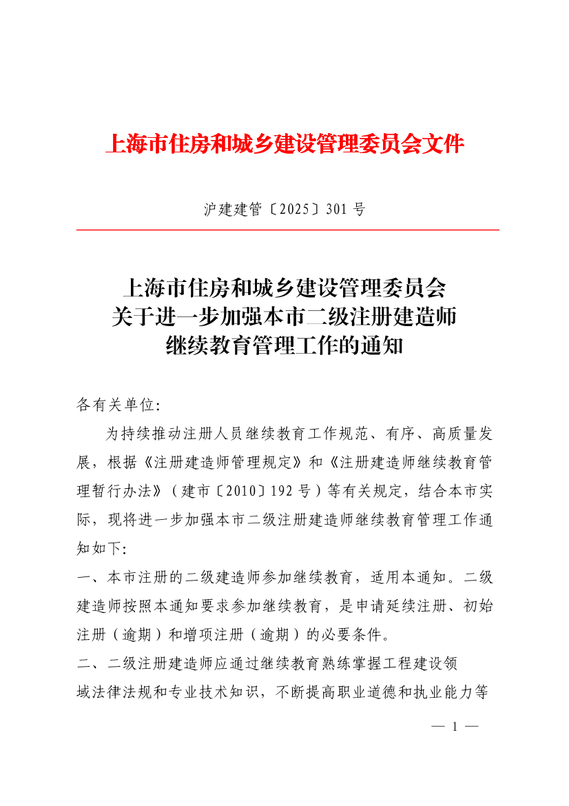 为持续推动注册人员继续教育工作规范、有序、高质量发展,根据《注册建造师管理规定》和《注册建造师继续教育管理暂行办法》(建市〔2010〕192号)等有关规定,结合本市实际,现将进一步加强本市二级注册建造师继续教育管理工作通知如下: