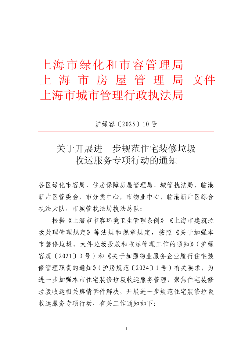 根据《上海市市容环境卫生管理条例》《上海市建筑垃圾处理管理规定》等法规和规章规定,按照《关于加强本 市装修垃圾、大件垃圾投放和收运管理工作的通知》(沪绿 容规〔2021〕3 号)和《关于加强物业服务企业履行住宅装修管理职责的通知》(沪房规范〔2024〕1 号)有关要求,为进一步加强本市住宅装修垃圾收运服务管理,聚焦住宅装修 垃圾收运相关舆情诉件解决,开展进一步规范住宅装修垃圾收运服务专项行动,有关工作通知如下: