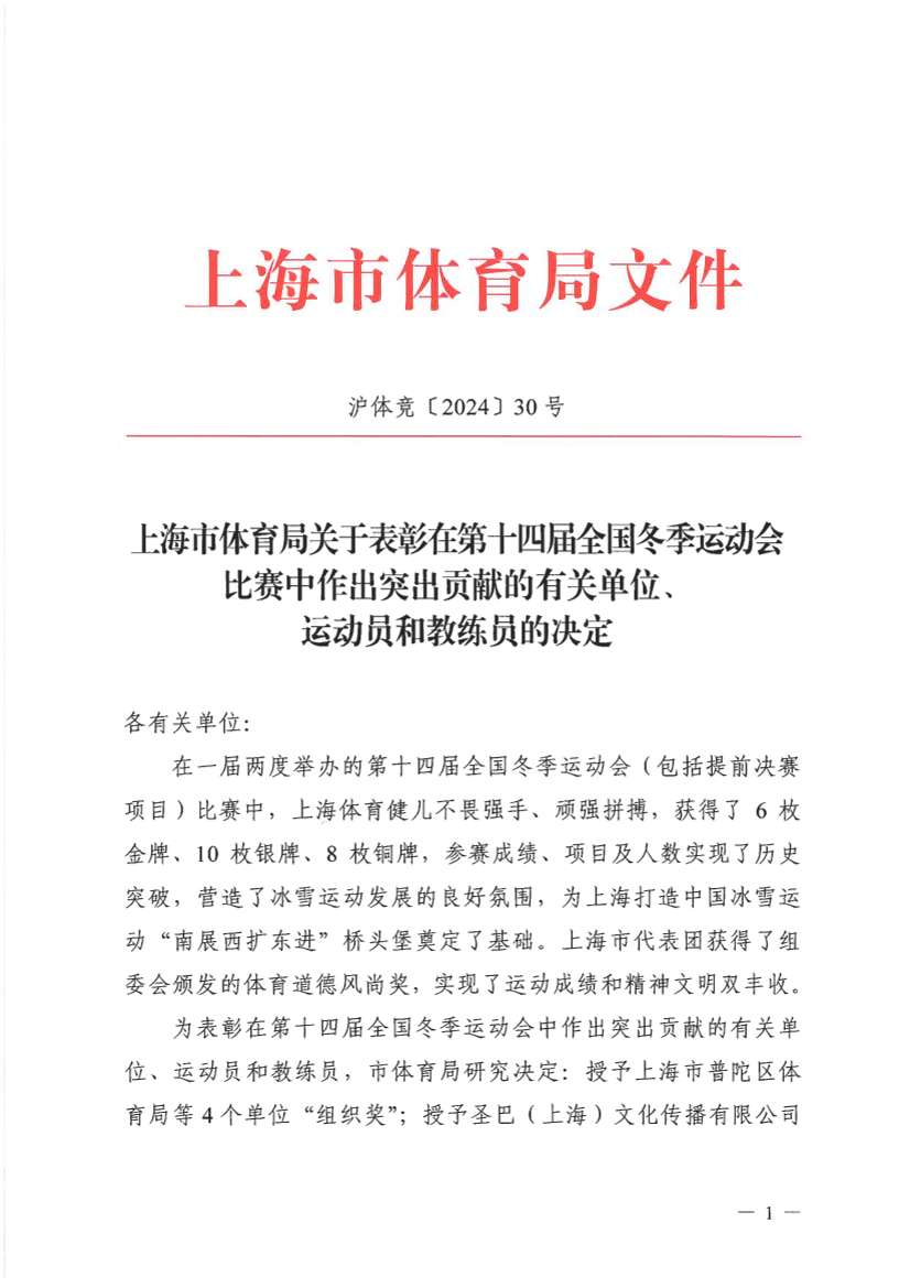 为表彰在第十四届全国冬季运动会中作出突出贡献的有关单位、运动员和教练员,市体育局研究决定:授予上海市普陀区体育局等4个单位“组织奖”;授予圣巴(上海)文化传播有限公司等2个单位“贡献奖”;授予上海市竞技体育训练管理中心田径运动中心“人才输送奖”;授予张珈宁等10名运动员、马延君等7名教练员“突出表现奖”。