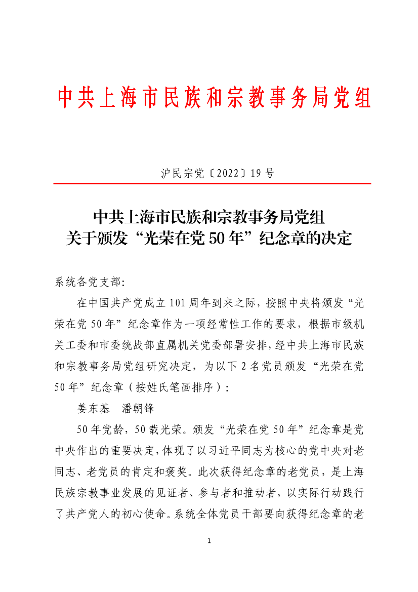 在中国共产党成立101周年到来之际,按照中央将颁发“光荣在党50年”纪念章作为一项经常性工作的要求,根据市级机关工委和市委统战部直属机关党委部署安排,经中共上海市民族和宗教事务局党组研究决定,为以下2名党员颁发“光荣在党50年”纪念章(按姓氏笔画排序):