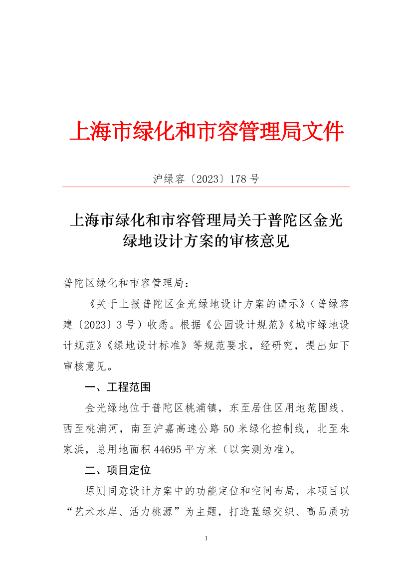 《关于上报普陀区金光绿地设计方案的请示》(普绿容建〔2023〕3号)收悉。根据《公园设计规范》《城市绿地设计规范》《绿地设计标准》等规范要求,经研究,提出如下审核意见。