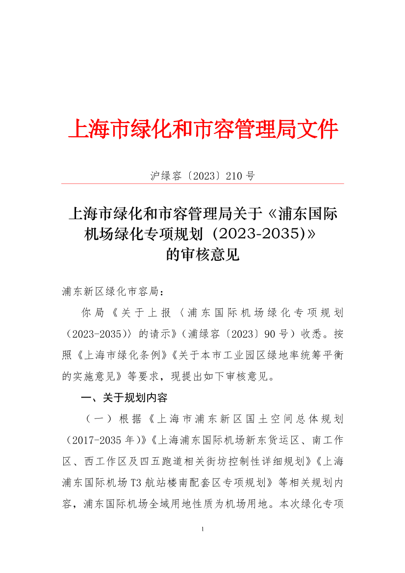 你局《关于上报〈浦东国际机场绿化专项规划(2023-2035)〉的请示》(浦绿容〔2023〕90号)收悉。按照《上海市绿化条例》《关于本市工业园区绿地率统筹平衡的实施意见》等要求,现提出如下审核意见。
