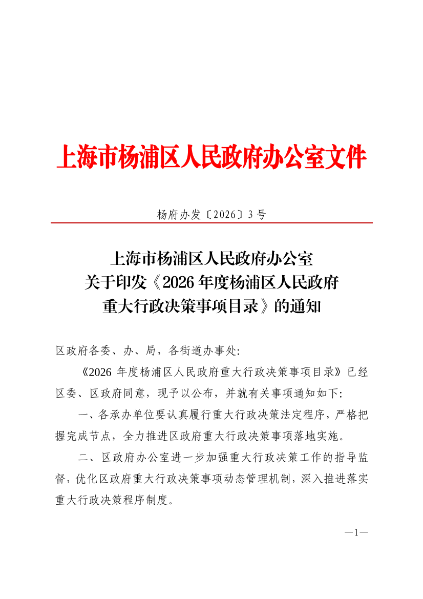 《2026年度杨浦区人民政府重大行政决策事项目录》已经区委、区政府同意,现予以公布,并就有关事项通知如下: