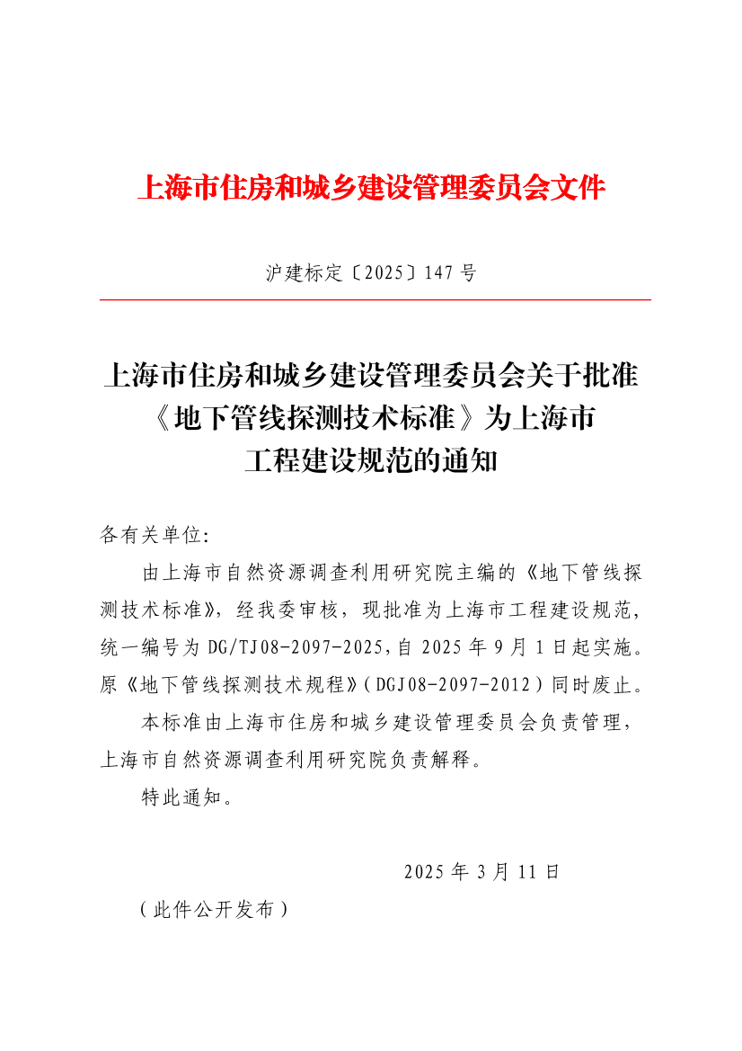 由上海市自然资源调查利用研究院主编的《地下管线探测技术标准》,经我委审核,现批准为上海市工程建设规范,统一编号为DG/TJ08-2097-2025,自2025年9月1日起实施。原《地下管线探测技术规程》(DGJ08-2097-2012)同时废止。
