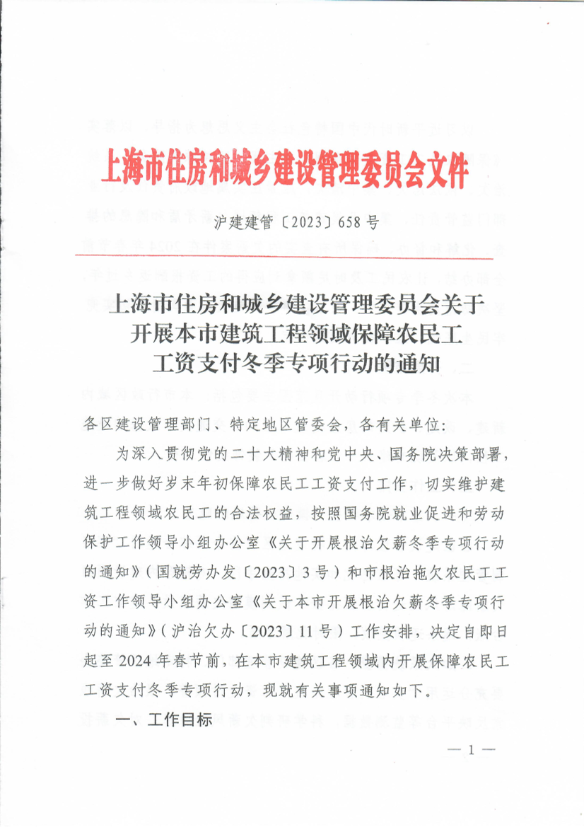 为深入贯彻党的二十大精神和党中央、国务院决策部署,进一步做好岁末年初保障农民工工资支付工作,切实维护建筑工程领域农民工的合法权益,按照国务院就业促进和劳动保护工作领导小组办公室《关于开展根治欠薪冬季专项行动的通知》(国就劳办发〔2023〕3号)和市根治拖欠农民工工资工作领导小组办公室《关于本市开展根治欠薪冬季专项行动的通知》(沪治欠办〔2023〕11号)工作安排,决定自即日起至2024年春节前,在本市建筑工程领域内开展保障农民工工资支付冬季专项行动,现就有关事项通知如下。