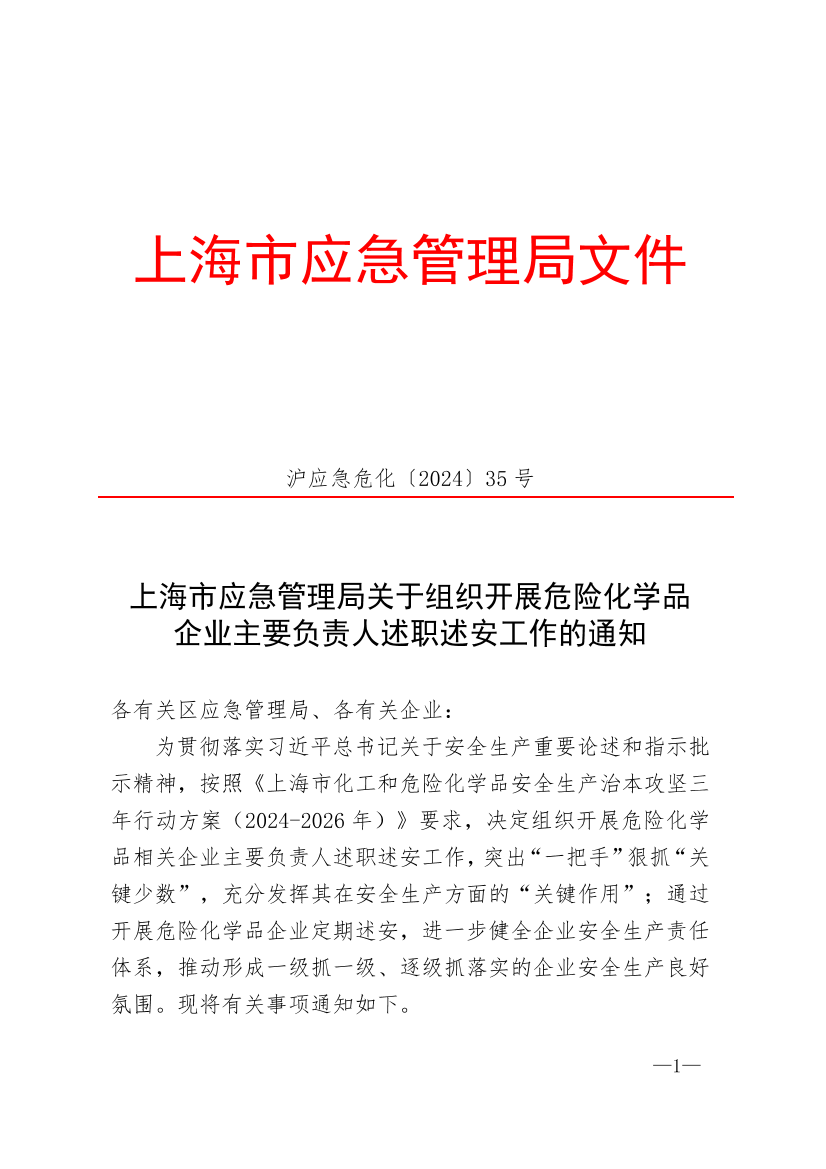 为贯彻落实习近平总书记关于安全生产重要论述和指示批示精神,按照《上海市化工和危险化学品安全生产治本攻坚三年行动方案(2024-2026年)》要求,决定组织开展危险化学品相关企业主要负责人述职述安工作,突出“一把手”狠抓“关键少数”,充分发挥其在安全生产方面的“关键作用”;通过开展危险化学品企业定期述安,进一步健全企业安全生产责任体系,推动形成一级抓一级、逐级抓落实的企业安全生产良好氛围。现将有关事项通知如下。