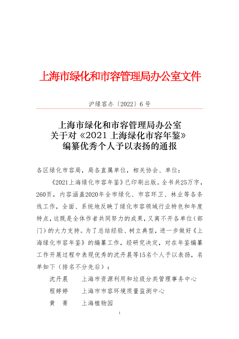 《2021上海绿化市容年鉴》已印刷出版。全书共25万字,260页,内容涵盖2020年全市绿化、市容环卫、林业等各条线工作,全面、系统地反映了绿化市容领域行业特色和年度特点,这既是全体作者共同努力的成果,又离不开各单位(部门)的大力支持。为了总结经验、树立典型,进一步做好《上海绿化市容年鉴》的编纂工作,经研究决定,对在年鉴编纂工作开展过程中表现优秀的沈丹晨等15名个人予以表扬,名单如下(排名不分先后):