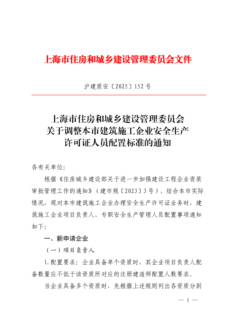 根据《住房城乡建设部关于进一步加强建设工程企业资质审批管理工作的通知》(建市规〔2023〕3号),结合本市实际情况,现对本市建筑施工企业办理安全生产许可证业务时,建筑施工企业项目负责人、专职安全生产管理人员配置事项通知如下: