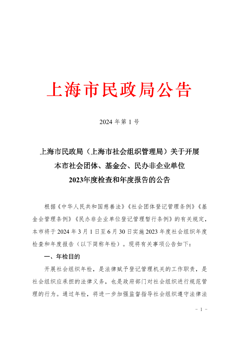 根据《中华人民共和国慈善法》《社会团体登记管理条例》《基金会管理条例》《民办非企业单位登记管理暂行条例》的有关规定,本市将于2024年3月1日至6月30日实施2023年度社会组织年度检查和年度报告(以下简称年检)。现将有关事项公告如下: