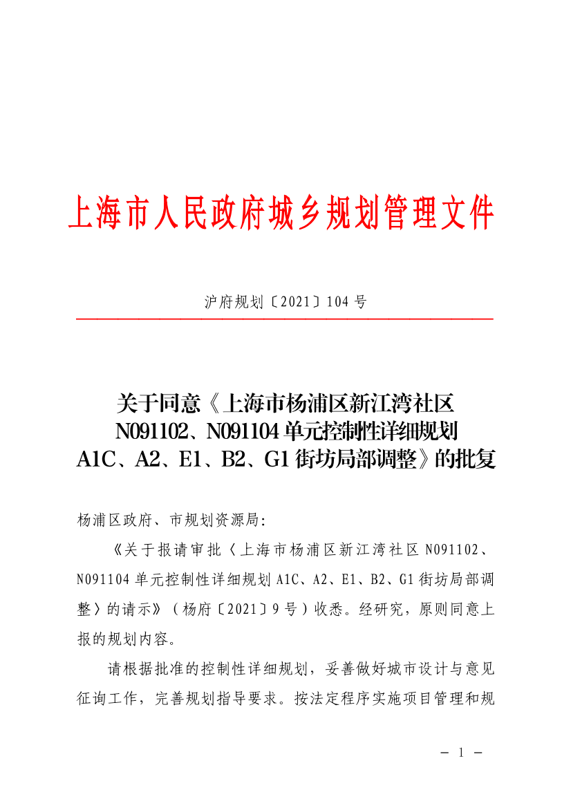 《关于报请审批〈上海市杨浦区新江湾社区N091102、N091104单元控制性详细规划A1C、A2、E1、B2、G1街坊局部调整〉的请示》(杨府〔2021〕9号)收悉。经研究,原则同意上报的规划内容。