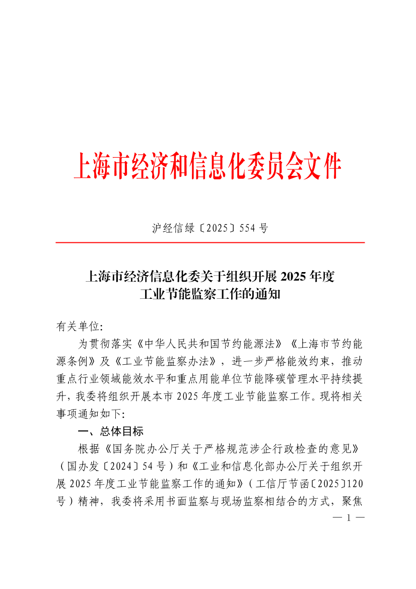为贯彻落实《中华人民共和国节约能源法》《上海市节约能源条例》及《工业节能监察办法》,进一步严格能效约束,推动重点行业领域能效水平和重点用能单位节能降碳管理水平持续提升,我委将组织开展本市2025年度工业节能监察工作。现将相关事项通知如下: