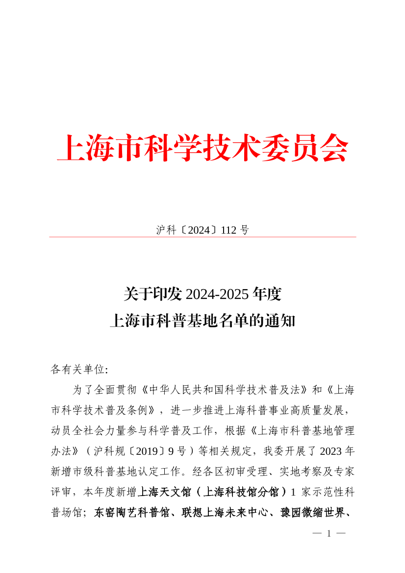 为了全面贯彻《中华人民共和国科学技术普及法》和《上海市科学技术普及条例》,进一步推进上海科普事业高质量发展,动员全社会力量参与科学普及工作,根据《上海市科普基地管理办法》(沪科规〔2019〕9号)等相关规定,我委开展了2023年新增市级科普基地认定工作。经各区初审受理、实地考察及专家评审,本年度新增上海天文馆(上海科技馆分馆)1家示范性科普场馆;东窑陶艺科普馆、联想上海未来中心、豫园微缩世界、奈尔宝儿童科技馆、普陀区公共卫生科普中心、上海航天科普基地、云端机器人科普基地、鹏新嘉定海洋世界、上海大来时间博物馆、上海电线电缆博物馆10家基础性科普基地。2024-2025年度上海市科普基地共305家。其中,示范性科普场馆57家,基础性科普基地213家,青少年科学创新实践工作站35家。