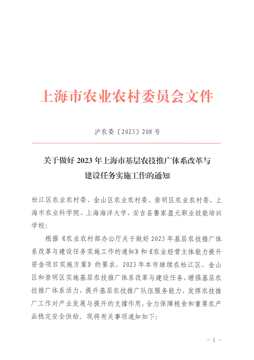 根据《农业农村部办公厅关于做好2023年基层农技推广体系改革与建设任务实施工作的通知》和《农业经营主体能力提升资金项目实施方案》的要求,2023年本市继续在松江区、金山区和崇明区实施基层农技推广体系改革与建设任务,增强基层农技推广体系活力,提升基层农技推广队伍服务能力,发挥农技推广工作对产业发展与提升的支撑作用,全力保障粮食和重要农产品稳定安全供给。现将有关事项通知如下: