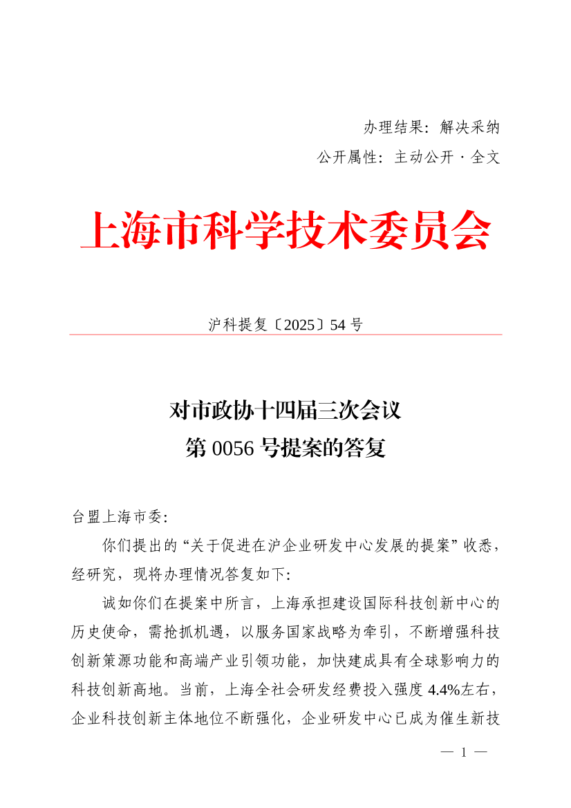 你们提出的“关于促进在沪企业研发中心发展的提案”收悉,经研究,现将办理情况答复如下: