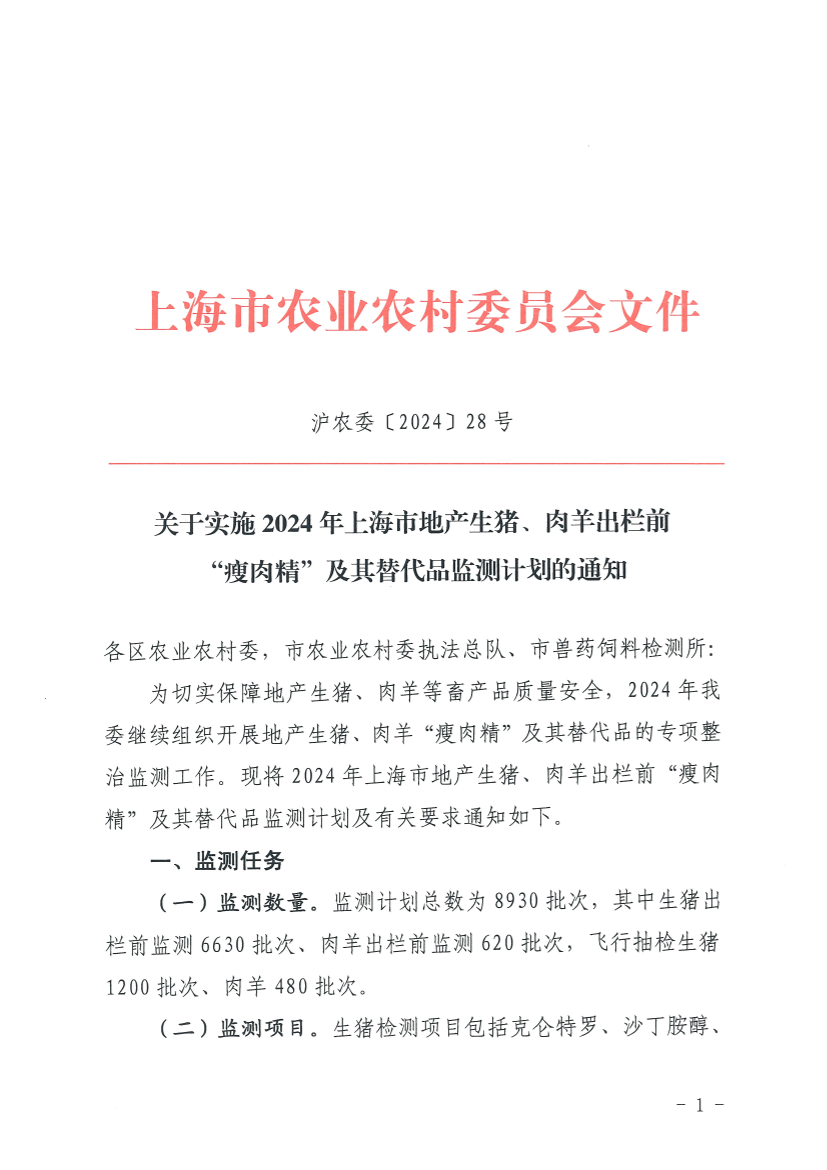 为切实保障地产生猪、肉羊等畜产品质量安全,2024年我委继续组织开展地产生猪、肉羊“瘦肉精”及其替代品的专项整治监测工作。现将2024年上海市地产生猪、肉羊出栏前“瘦肉精”及其替代品监测计划及有关要求通知如下。