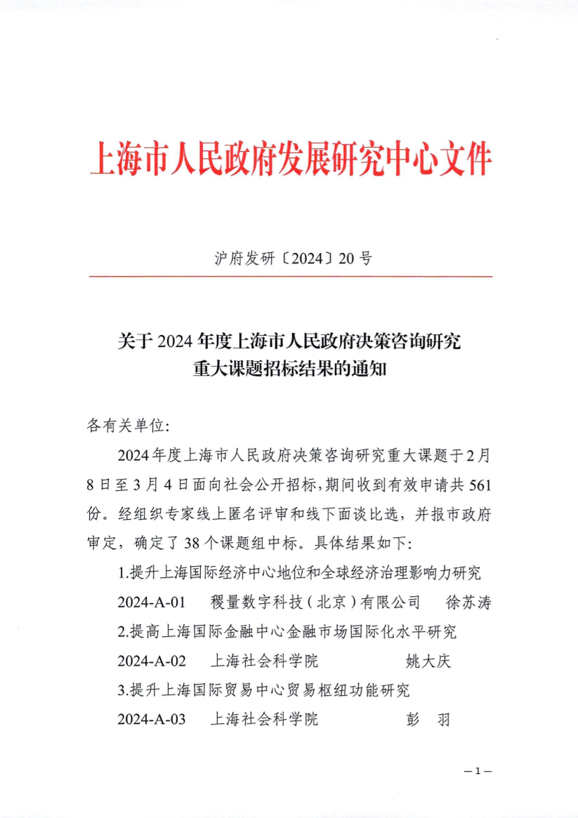 2024年度上海市人民政府决策咨询研究重大课题于2月8日至3月4日面向社会公开招标,期间收到有效申请共561份。经组织专家线上匿名评审和线下面谈比选,并报市政府审定,确定了38个课题组中标。具体结果如下: