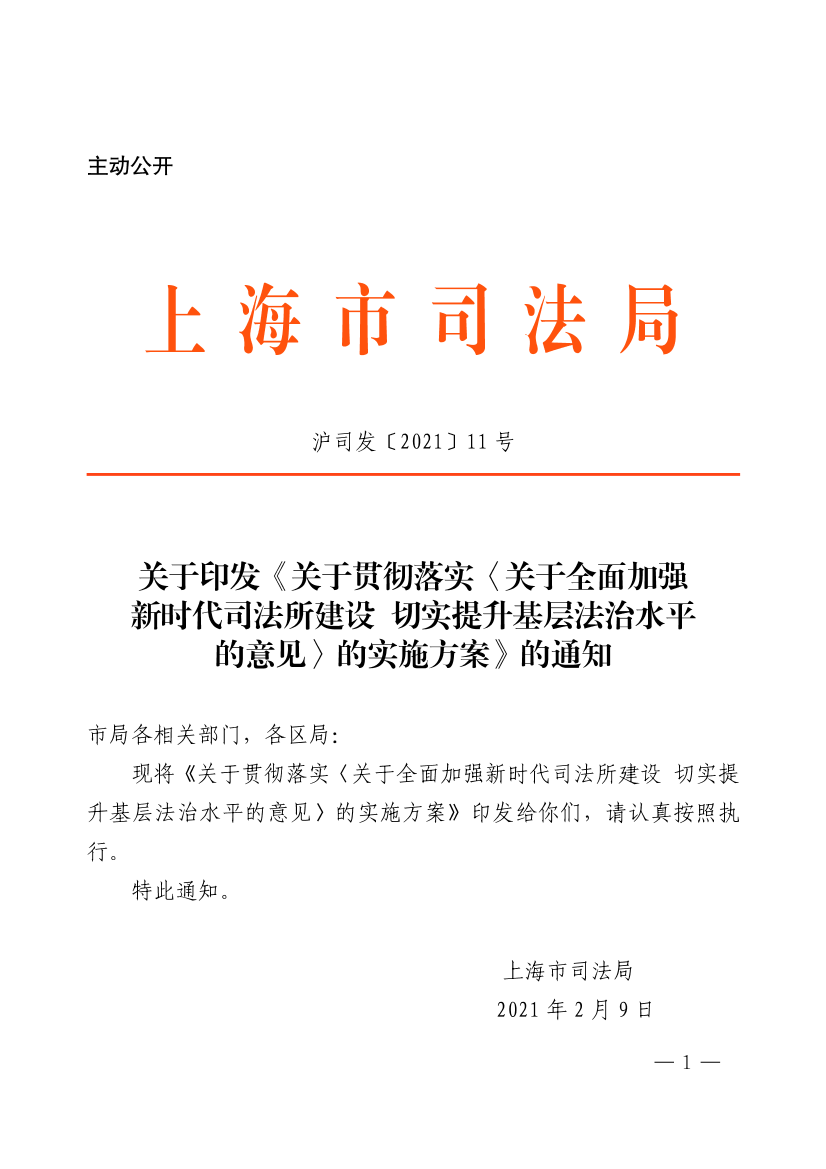 《关于全面加强新时代司法所建设 切实提升基层法治水平的意见》(沪司发〔2020〕108号)(下称《意见》)已于2020年12月18日正式印发。为更好贯彻落实《意见》精神,全面加强新时代司法所建设,切实提升基层法治水平,结合工作实际,制定本实施方案。