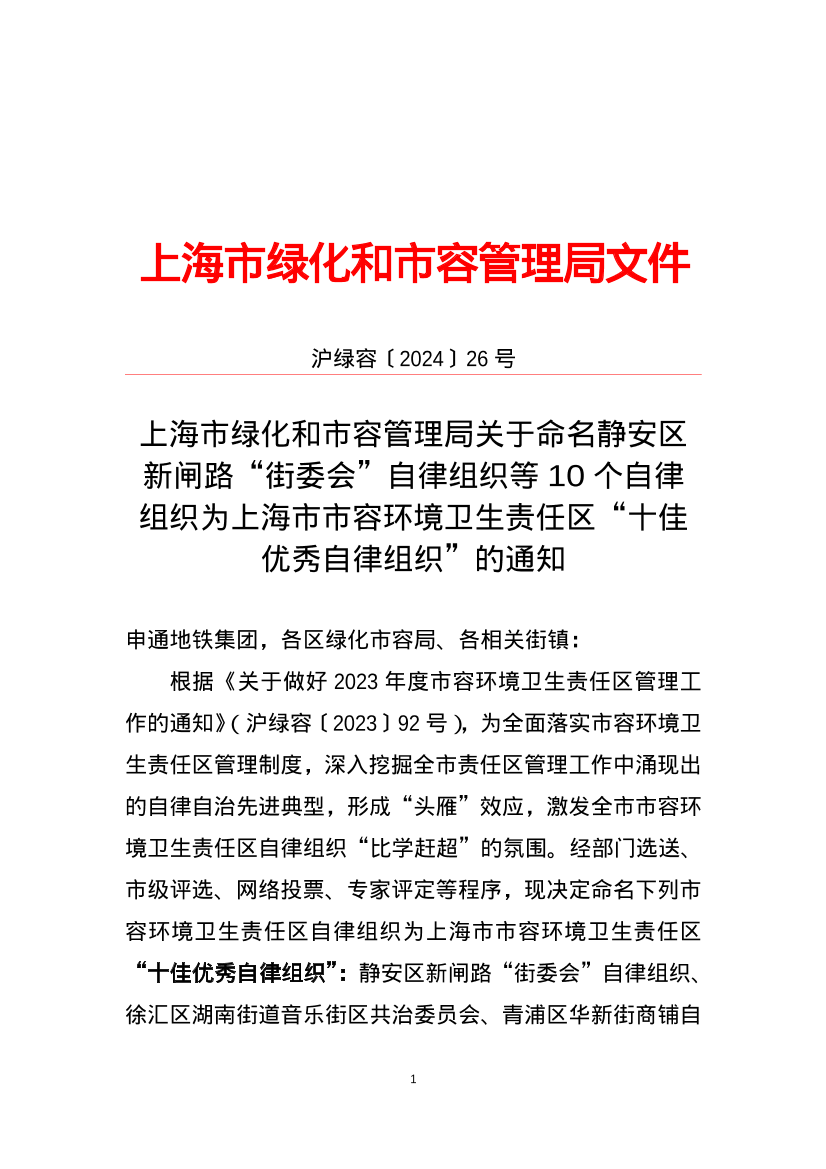 根据《关于做好 2023年度市容环境卫生责任区管理工作的通知》(沪绿容〔2023〕92号),为全面落实市容环境卫生责任区管理制度,深入挖掘全市责任区管理工作中涌现出的自律自治先进典型,形成“头雁”效应,激发全市市容环境卫生责任区自律组织“比学赶超”的氛围。经部门选送、市级评选、网络投票、专家评定等程序,现决定命名下列市容环境卫生责任区自律组织为上海市市容环境卫生责任区“十佳优秀自律组织”:静安区新闸路“街委会”自律组织、徐汇区湖南街道音乐街区共治委员会、青浦区华新街商铺自律小组、长宁区新华·中央活动区自律小组、金山区美丽一条埭自律小组、黄浦区西部街区治理委员会商铺联盟、虹口区曲阳路街道二片区商铺自律联盟、松江区洞泾镇云堡未来市自律组织、浦东新区北中路商户联盟、普陀区中潭一哩。