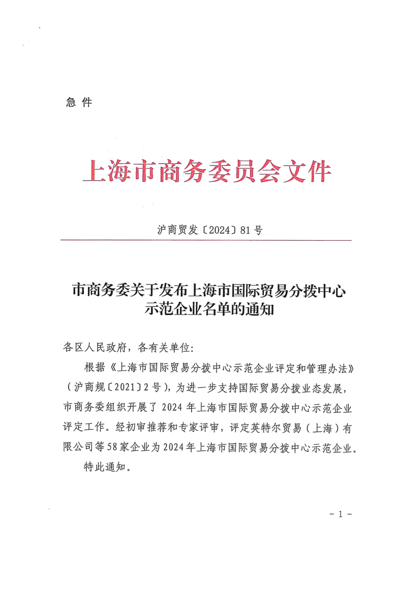 根据《上海市国际贸易分拨中心示范企业评定和管理办法》(沪商规〔2021〕2号),为进一步支持国际贸易分拨业态发展,市商务委组织开展了2024年上海市国际贸易分拨中心示范企业评定工作。经初审推荐和专家评审,评定英特尔贸易(上海)有限公司等58家企业为2024年上海市国际贸易分拨中心示范企业。