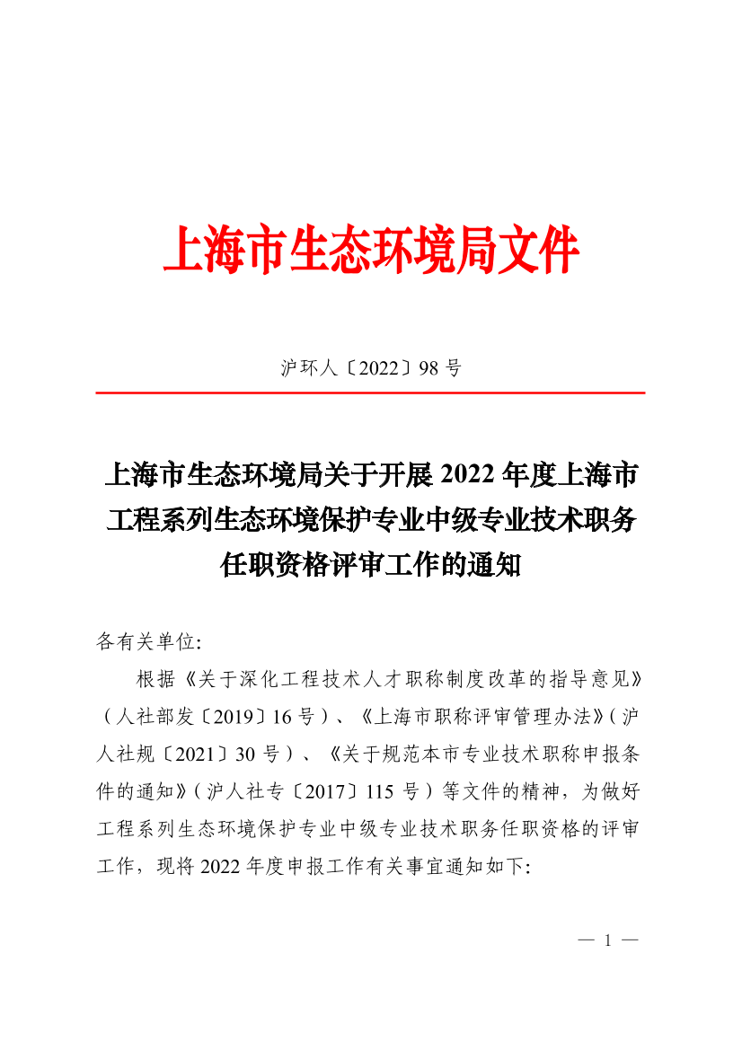 根据《关于深化工程技术人才职称制度改革的指导意见》(人社部发〔2019〕16号)、《上海市职称评审管理办法》(沪人社规〔2021〕30号)、《关于规范本市专业技术职称申报条件的通知》(沪人社专〔2017〕115号)等文件的精神,为做好工程系列生态环境保护专业中级专业技术职务任职资格的评审工作,现将2022年度申报工作有关事宜通知如下: