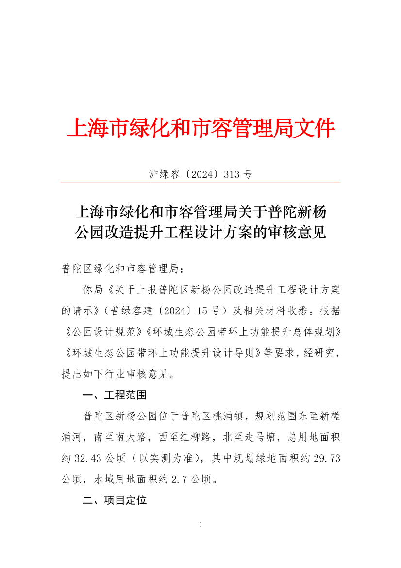 你局《关于上报普陀区新杨公园改造提升工程设计方案的请示》(普绿容建〔2024〕15号)及相关材料收悉。根据《公园设计规范》《环城生态公园带环上功能提升总体规划》《环城生态公园带环上功能提升设计导则》等要求,经研究,提出如下行业审核意见。