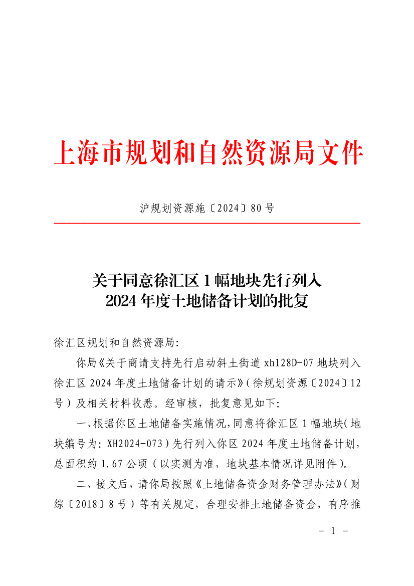 一、根据你区土地储备实施情况,同意将徐汇区1幅地块(地块编号为:XH2024-073)先行列入你区2024年度土地储备计划,总面积约1.67公顷(以实测为准,地块基本情况详见附件)。