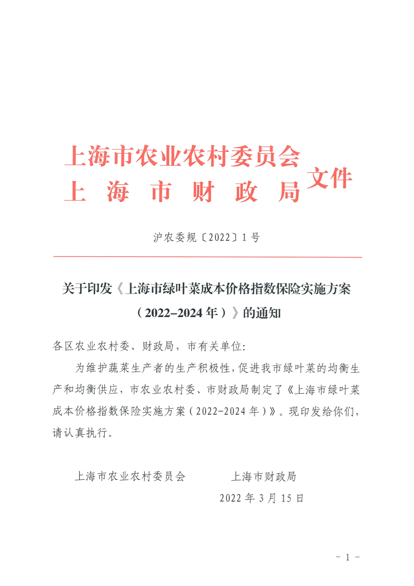 为维护蔬菜生产者的生产积极性,促进我市绿叶菜的均衡生产和均衡供应,市农业农村委、市财政局制定了《上海市绿叶菜成本价格指数保险实施方案(2022-2024年)》。现印发给你们,请认真执行。