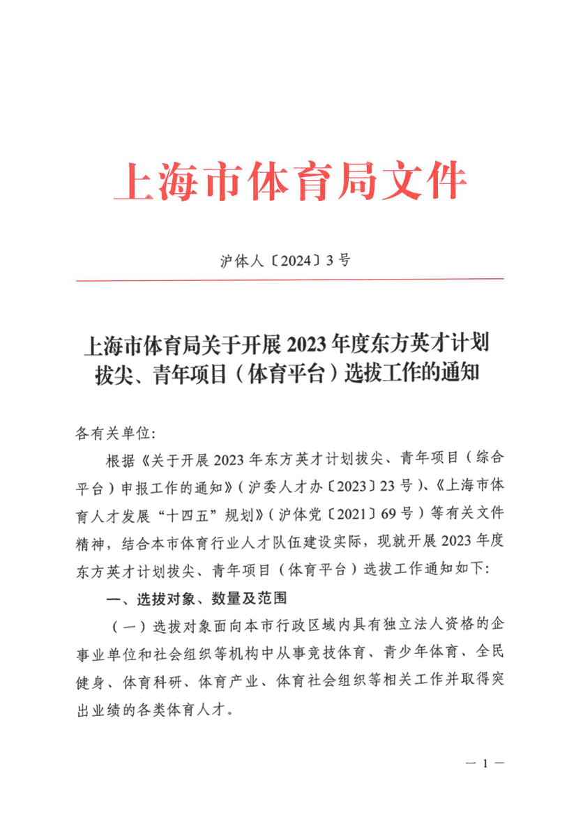 根据《关于开展2023年东方英才计划拔尖、青年项目(综合平台)申报工作的通知》(沪委人才办〔2023〕23号)、《上海市体育人才发展“十四五”规划》(沪体党〔2021〕69号)等有关文件精神,结合本市体育行业人才队伍建设实际,现就开展2023年度东方英才计划拔尖、青年项目(体育平台)选拔工作通知如下: