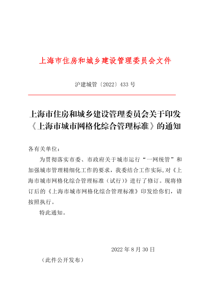 为贯彻落实市委、市政府关于城市运行“一网统管”和加强城市管理精细化工作的要求,我委结合工作实际,对《上海市城市网格化综合管理标准(试行)》进行了修订。现将修订后的《上海市城市网格化综合管理标准》印发给你们,请按照执行。