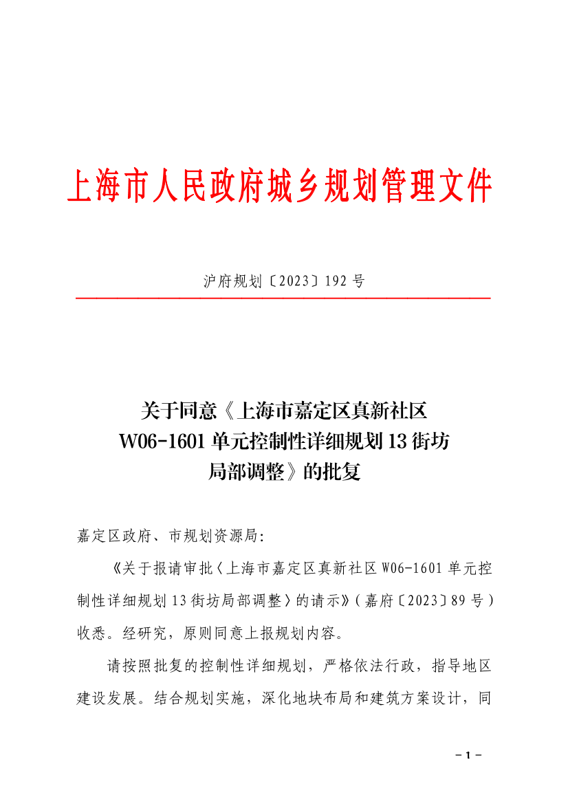 《关于报请审批〈上海市嘉定区真新社区W06-1601单元控制性详细规划13街坊局部调整〉的请示》(嘉府〔2023〕89号)收悉。经研究,原则同意上报规划内容。