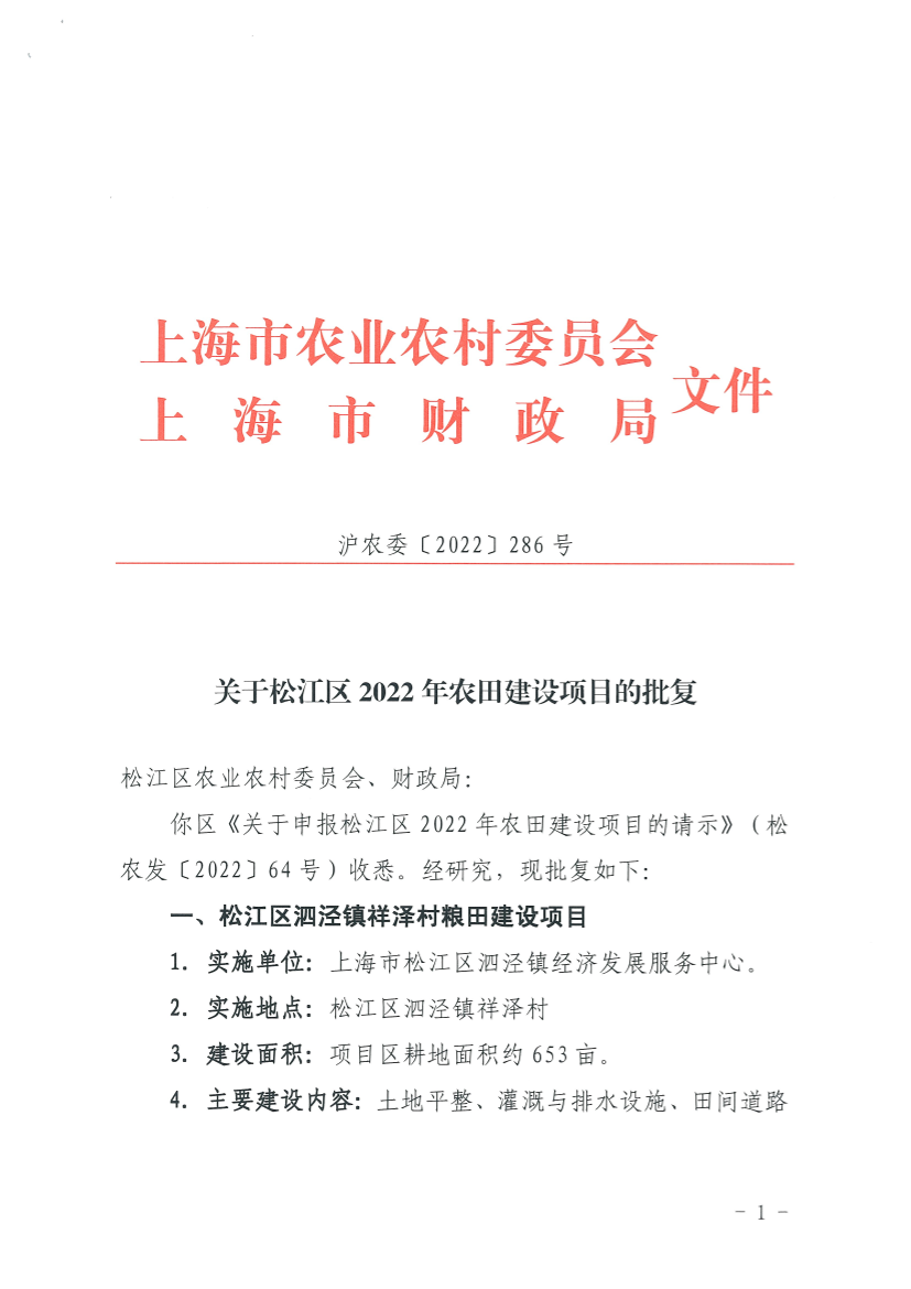附件:1. 松江区泗泾镇祥泽村粮田建设项目投资明细表