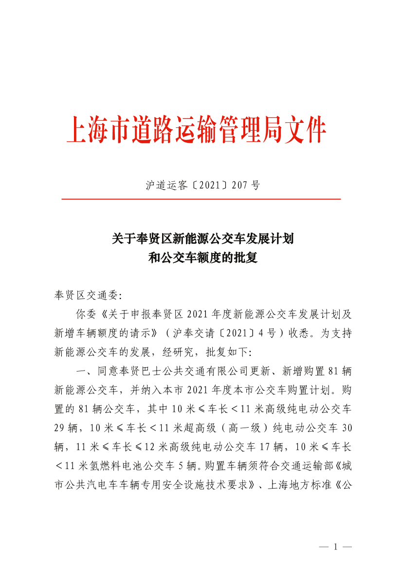 一、同意奉贤巴士公共交通有限公司更新、新增购置81辆新能源公交车,并纳入本市2021年度本市公交车购置计划。购置的81辆公交车,其中10米≤车长<11米高级纯电动公交车29辆,10米≤车长<11米超高级(高一级)纯电动公交车30辆,11米≤车长≤12米高级纯电动公交车17辆,10米≤车长<11米氢燃料电池公交车5辆。购置车辆须符合交通运输部《城市公共汽电车车辆专用安全设施技术要求》、上海地方标准《公交客车通用技术要求》等文件要求。