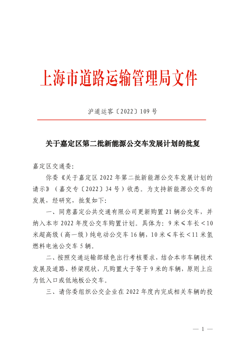 一、同意嘉定公共交通有限公司更新购置21辆公交车,并纳入本市2022年度公交车购置计划。具体为:9米≤车长<10米超高级(高一级)纯电动公交车16辆,10米≤车长<11米氢燃料电池公交车5辆。