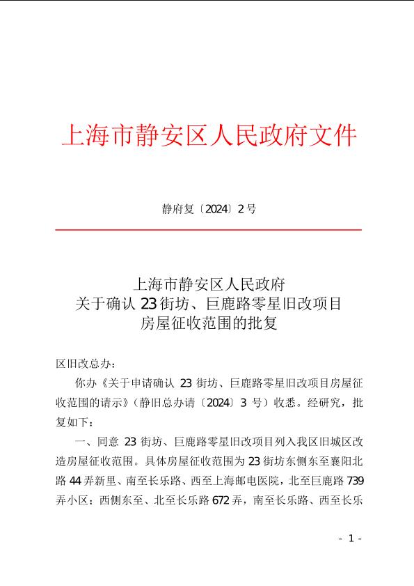 你办《关于申请确认23街坊、巨鹿路零星旧改项目房屋征收范围的请示》(静旧总办请〔2024〕3号)收悉。经研究,批复如下: