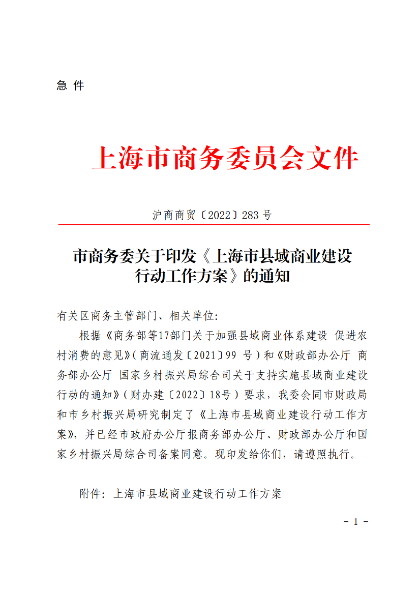 根据《商务部等17部门关于加强县域商业体系建设 促进农村消费的意见》(商流通发〔2021〕99 号)和《财政部办公厅 商务部办公厅 国家乡村振兴局综合司关于支持实施县域商业建设行动的通知》(财办建〔2022〕18号)要求,我委会同市财政局和市乡村振兴局研究制定了《上海市县域商业建设行动工作方案》,并已经市政府办公厅报商务部办公厅、财政部办公厅和国家乡村振兴局综合司备案同意。现印发给你们,请遵照执行。
