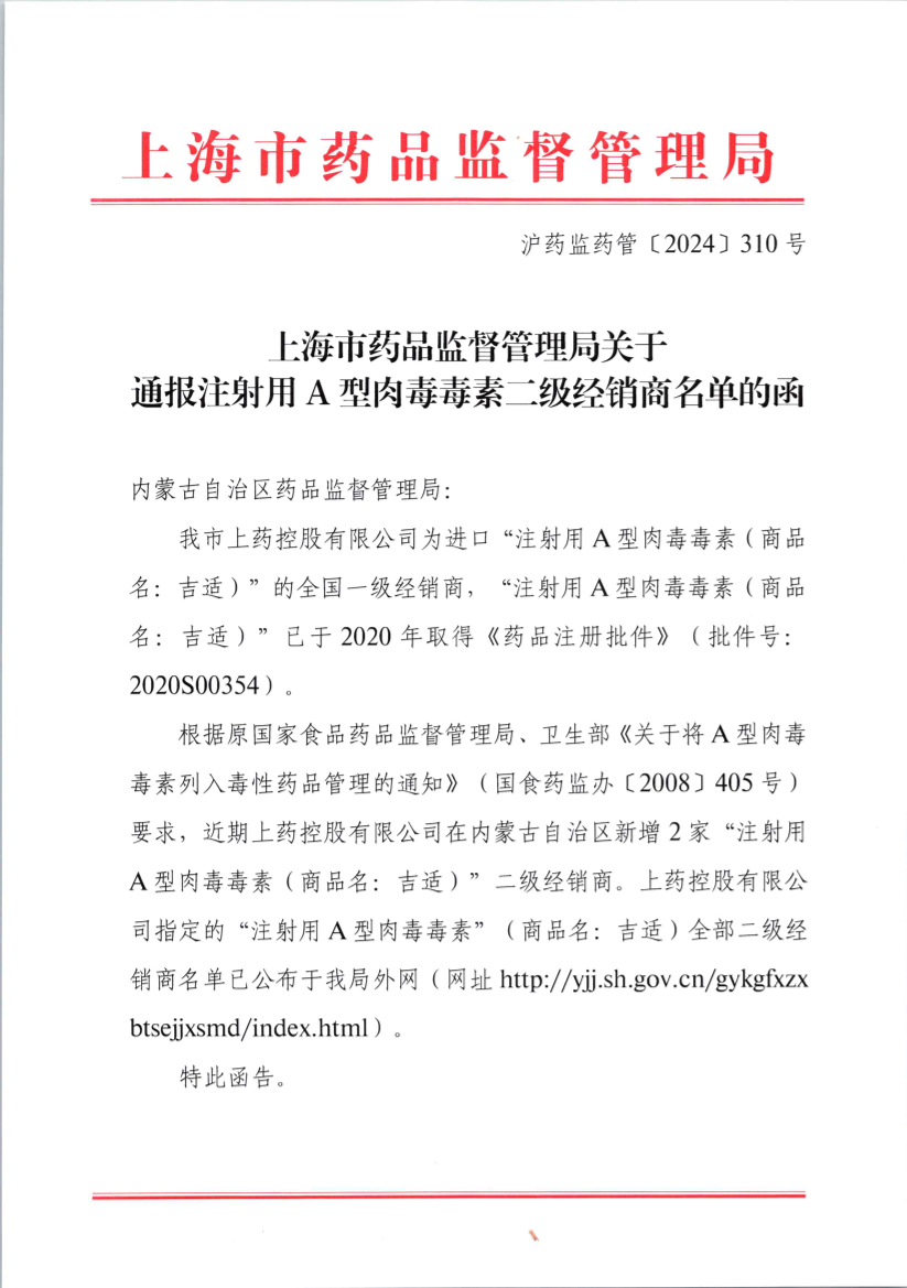 根据原国家食品药品监督管理局、卫生部《关于将A型肉毒毒素列入毒性药品管理的通知》(国食药监办〔2008〕405号)要求,近期上药控股有限公司在内蒙古自治区新增2家“注射用A型肉毒毒素(商品名:吉适)”二级经销商。上药控股有限公司指定的“注射用A型肉毒毒素”(商品名:吉适)全部二级经销商名单已公布于我局外网(网址http://yjj.sh.gov.cn/gykgfxzxbtsejjxsmd/index.html)。
