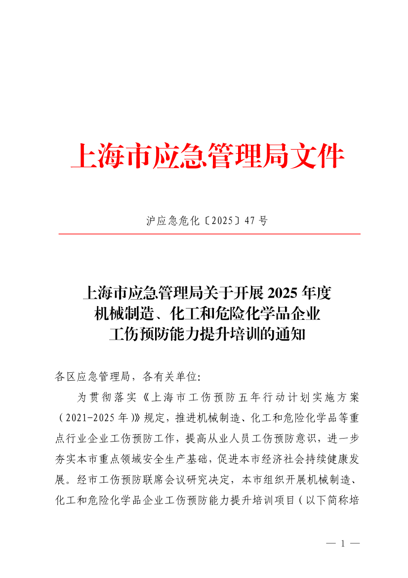 为贯彻落实《上海市工伤预防五年行动计划实施方案(2021-2025年)》规定,推进机械制造、化工和危险化学品等重点行业企业工伤预防工作,提高从业人员工伤预防意识,进一步夯实本市重点领域安全生产基础,促进本市经济社会持续健康发展。经市工伤预防联席会议研究决定,本市组织开展机械制造、化工和危险化学品企业工伤预防能力提升培训项目(以下简称培训项目),由上海市应急管理与安全生产协会和上海市化工行业协会分别组织实施。现就有关工作通知如下。