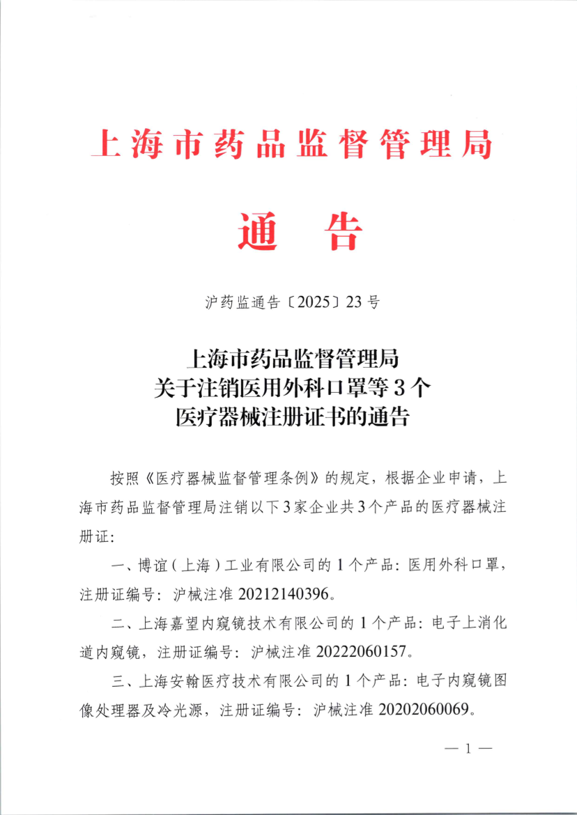 一、博谊(上海)工业有限公司的1个产品:医用外科口罩,注册证编号:沪械注准20212140396。