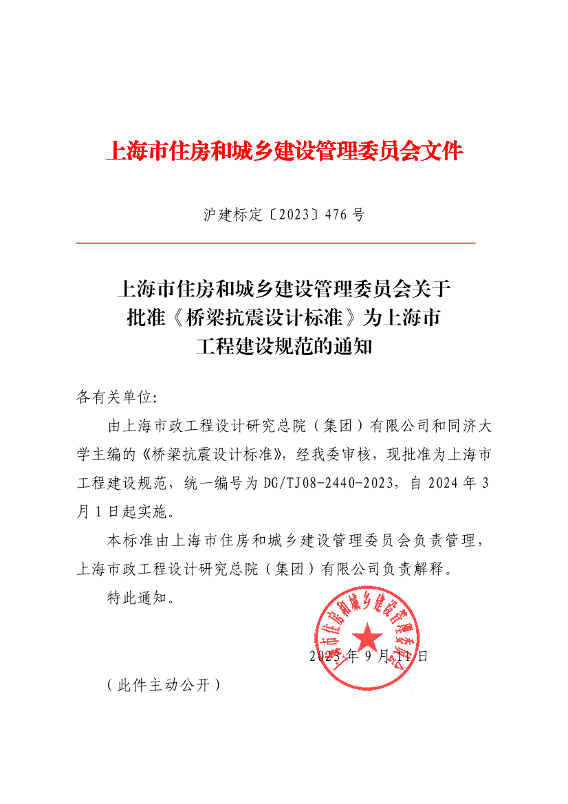 由上海市政工程设计研究总院(集团)有限公司和同济大学主编的《桥梁抗震设计标准》,经我委审核,现批准为上海市工程建设规范,统一编号为DG/TJ08-2440-2023,自2024年3月1日起实施。